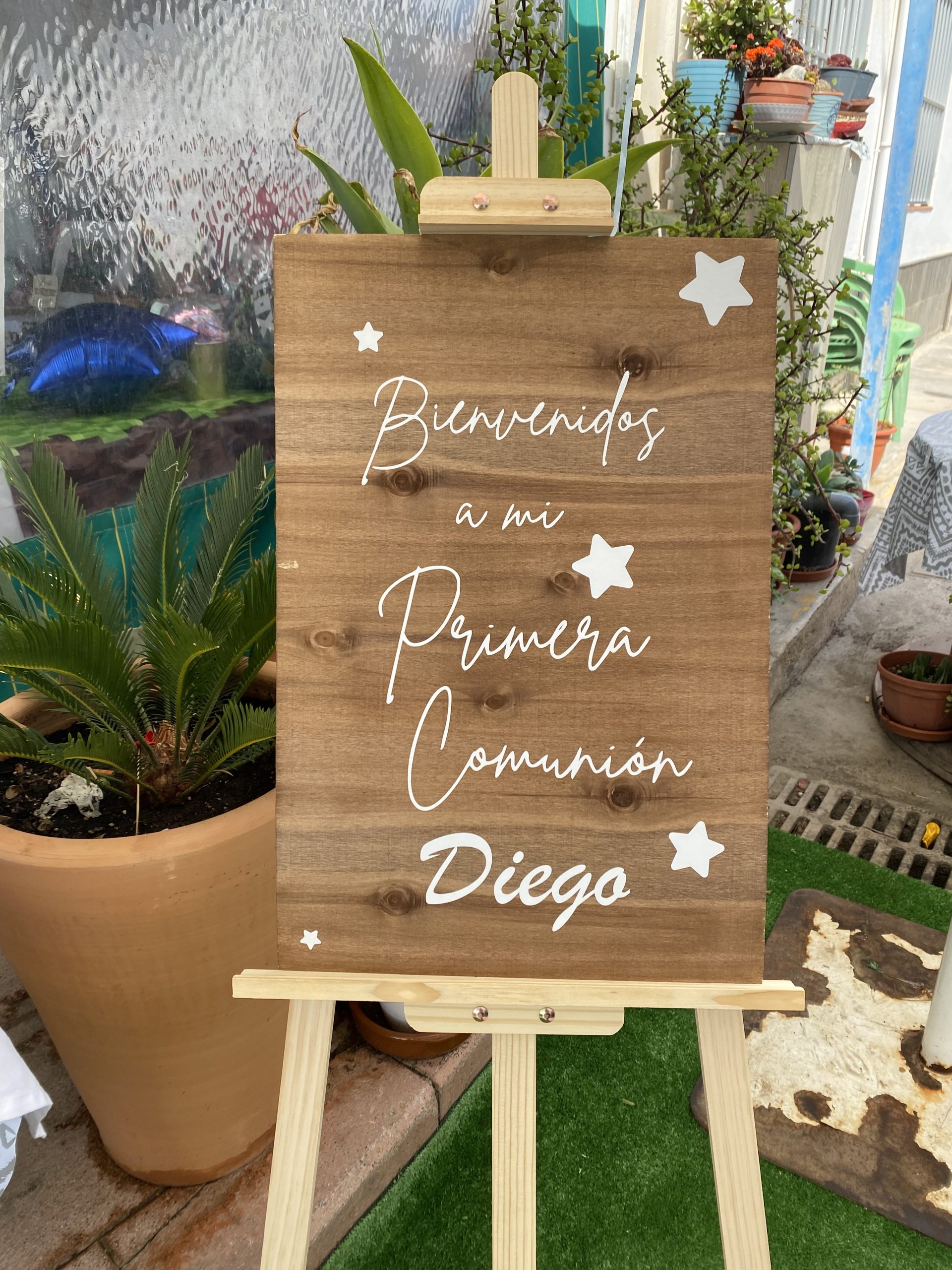 Cartel de bienvenida de madera con letras en vinilo blanco.