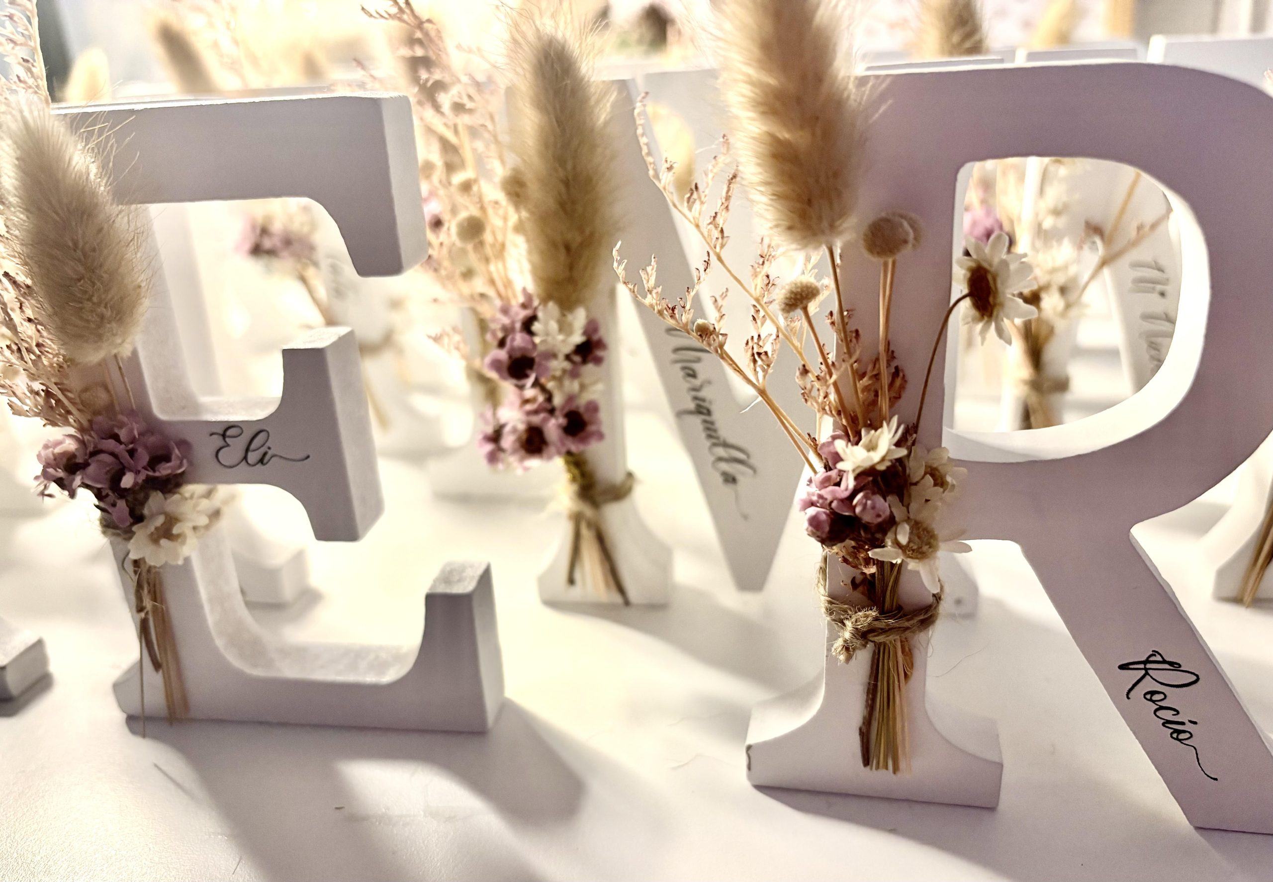 Iniciales de madera con el nombre grabado, y el ramito, a elegir.